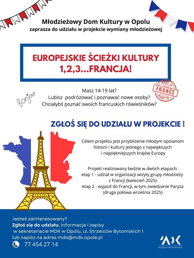 Masz 14-19 lat? Lubisz podróżować i poznawać nowe osoby? Chciałbyś spotkać swoich francuskich rówieśników? Weź udział w projekcie wymiany młodzieżowej EUROPEJSKIE ŚCIEŻKI KULTURY – 1, 2, 3... FRANCJA!