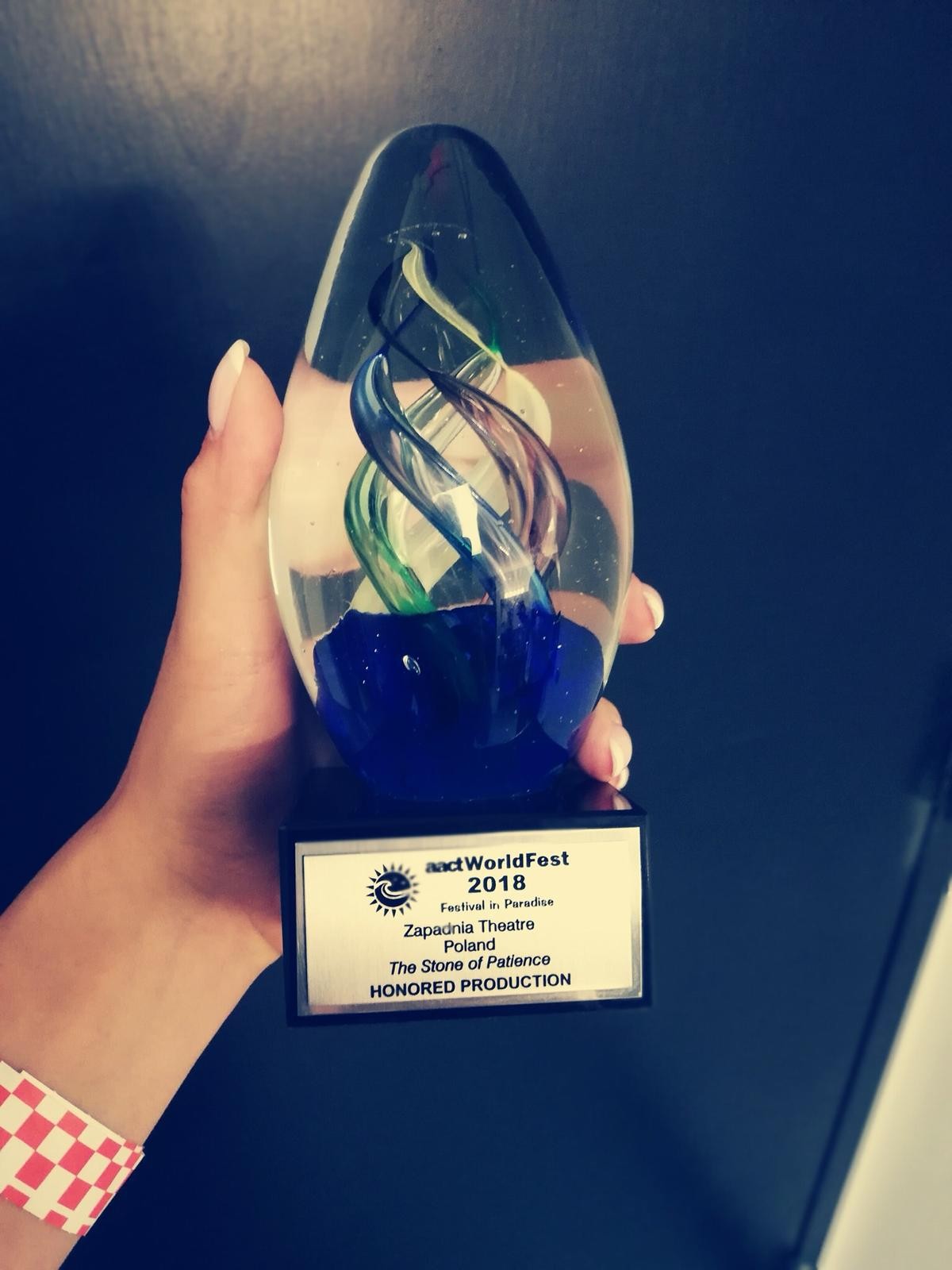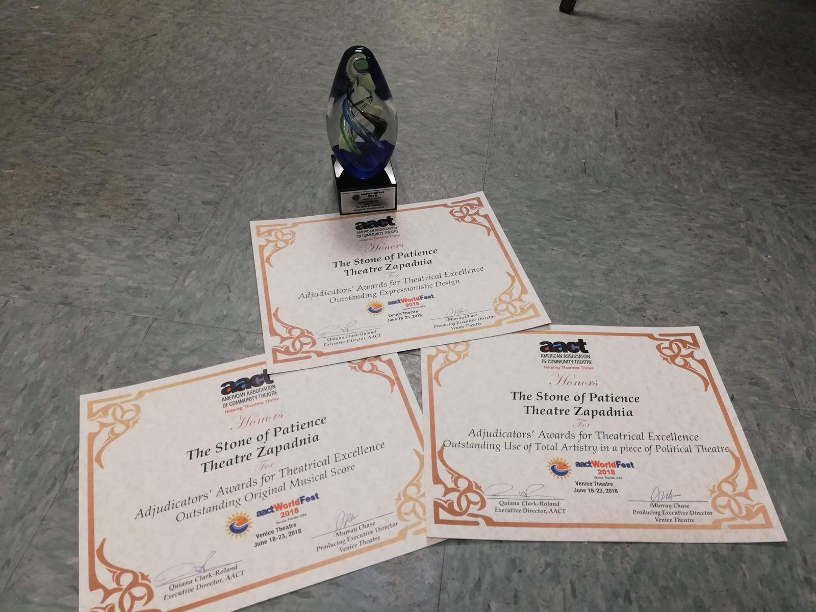 Aż trzema nagrodami jurorzy międzynarodowego festiwalu teatralnego AACT World Fest w Venice na Florydzie (USA) uhonorowali spektakl "Kamień cierpliwości" w wykonaniu Teatru ZAPADNIA z opolskiego MDK.
