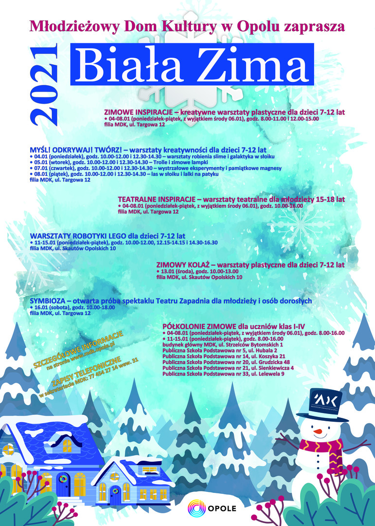 Ruszyły zapisy na bezpłatne warsztaty artystyczne i zajęcia otwarte BIAŁA ZIMA 2021, organizowane przez opolski MDK w czasie nadchodzących ferii.