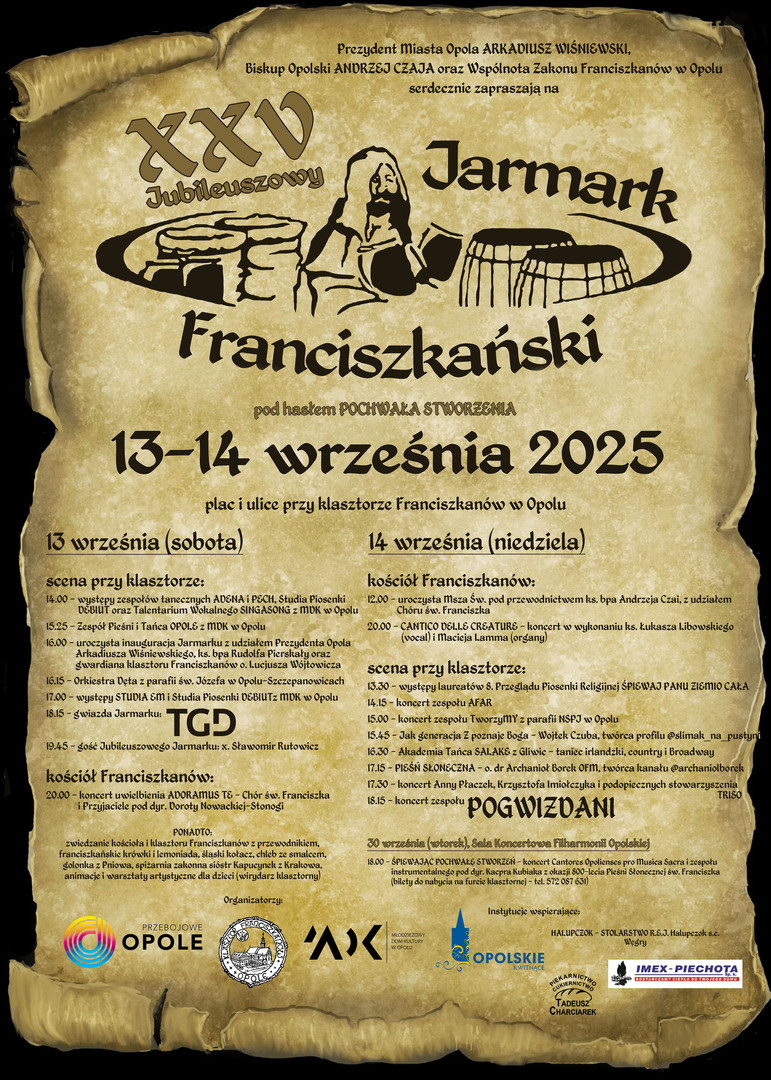 Już w najbliższy weekend (13-14 września) Prezydent Miasta Opola Arkadiusz Wiśniewski, Biskup Opolski Andrzej Czaja, Wspólnota Zakonu Franciszkanów w Opolu oraz Młodzieżowy Dom Kultury w Opolu serdecznie zapraszają na jubileuszowy, 25. Jarmark Franciszkański.