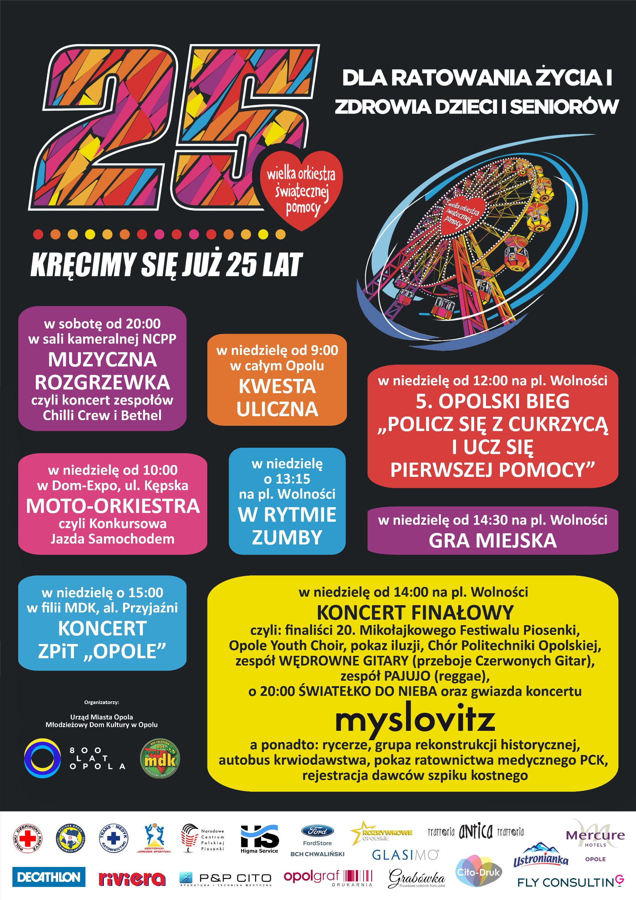 W samo południe, sprzed sceny na placu Wolności, wystartuje 5. Opolski Bieg POLICZ SIĘ Z CUKRZYCĄ I NAUCZ SIĘ PIERWSZEJ POMOCY, o 13.15 zgromadzona publiczność zakołysze się w rytm wspólnej zumby, a o 14.30 wszyscy chętni będą mogli wziąć udział w grze miejskiej.