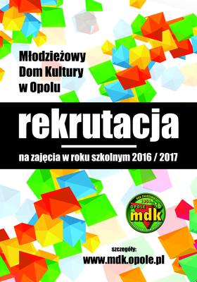 Młodzieżowy Dom Kultury w Opolu rozpoczyna dziś (16.05) pierwszy etap rekrutacji na zajęcia artystyczne, edukacyjne i sportowe, organizowane w roku szkolnym 2016/2017. Przypominamy, że - zgodnie z ustawą o systemie oświaty - w pierwszym i drugim etapie rekrutacji mogą brać udział jedynie kandydaci zamieszkali na terenie miasta Opola. A oto pozostałe szczegóły. [...]