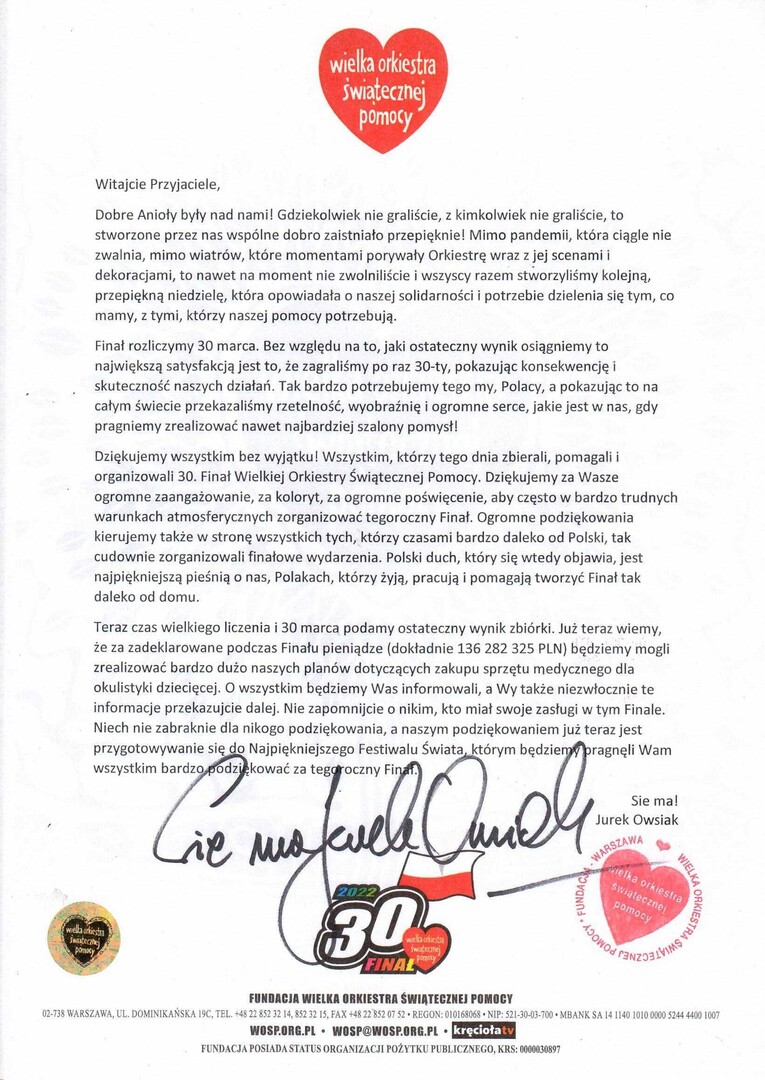 A w załączeniu (poniżej) przedstawiamy oficjalne rozliczenie opolskiego sztabu, potwierdzone przez Jurka Owsiaka i Fundację WOŚP.