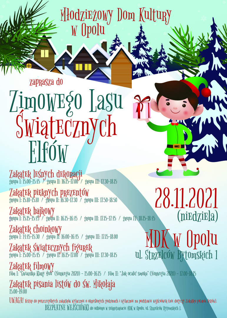 Już 28 listopada (niedziela) budynek MDK przy ul. Strzelców Bytomskich 1 zamieni się w Zimowy Las Świątecznych Elfów, w którym najmłodsi mieszkańcy Opola i ich rodzice będą mogli własnoręcznie wykonać świąteczne dekoracje, nauczyć się pakowania prezentów, posłuchać magicznych bajek, obejrzeć fantastyczne filmy, a także napisać list do świętego Mikołaja.