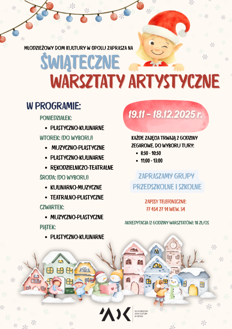 Młodzieżowy Dom Kultury w Opolu serdecznie zaprasza dzieci przedszkolne i uczniów klas I-III szkół podstawowych na świateczne warsztaty artystyczne.