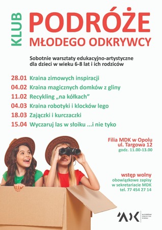 sobotnie warsztaty edukacyjno-artystyczne dla dzieci w wieku 6-8 lat i ich rodziców / wstęp wolny / obowiązkowe zapisy w sekretariacie MDK, tel. 77 454 27 14 wew. 31