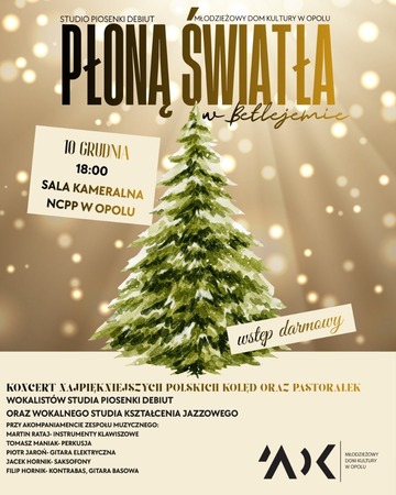 koncert najpiękniejszych polskich kolęd i pastorałek w wykonaniu wokalistów Studia Piosenki DEBIUT i Wokalnego Studia Kształcenia Jazzowego przy akompaniamencie zespołu muzycznego pod dyr. Martina Rataja / sala kameralna NCPP w Opolu, ul. Piastowska 14A / wstęp wolny
